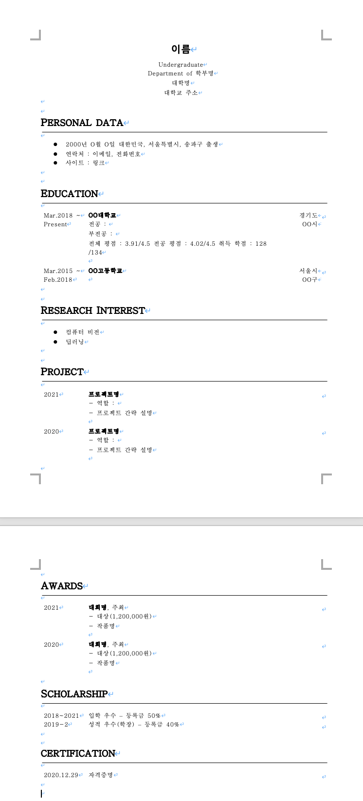 영어 글꼴은 Times New Roman 로 사용했다.